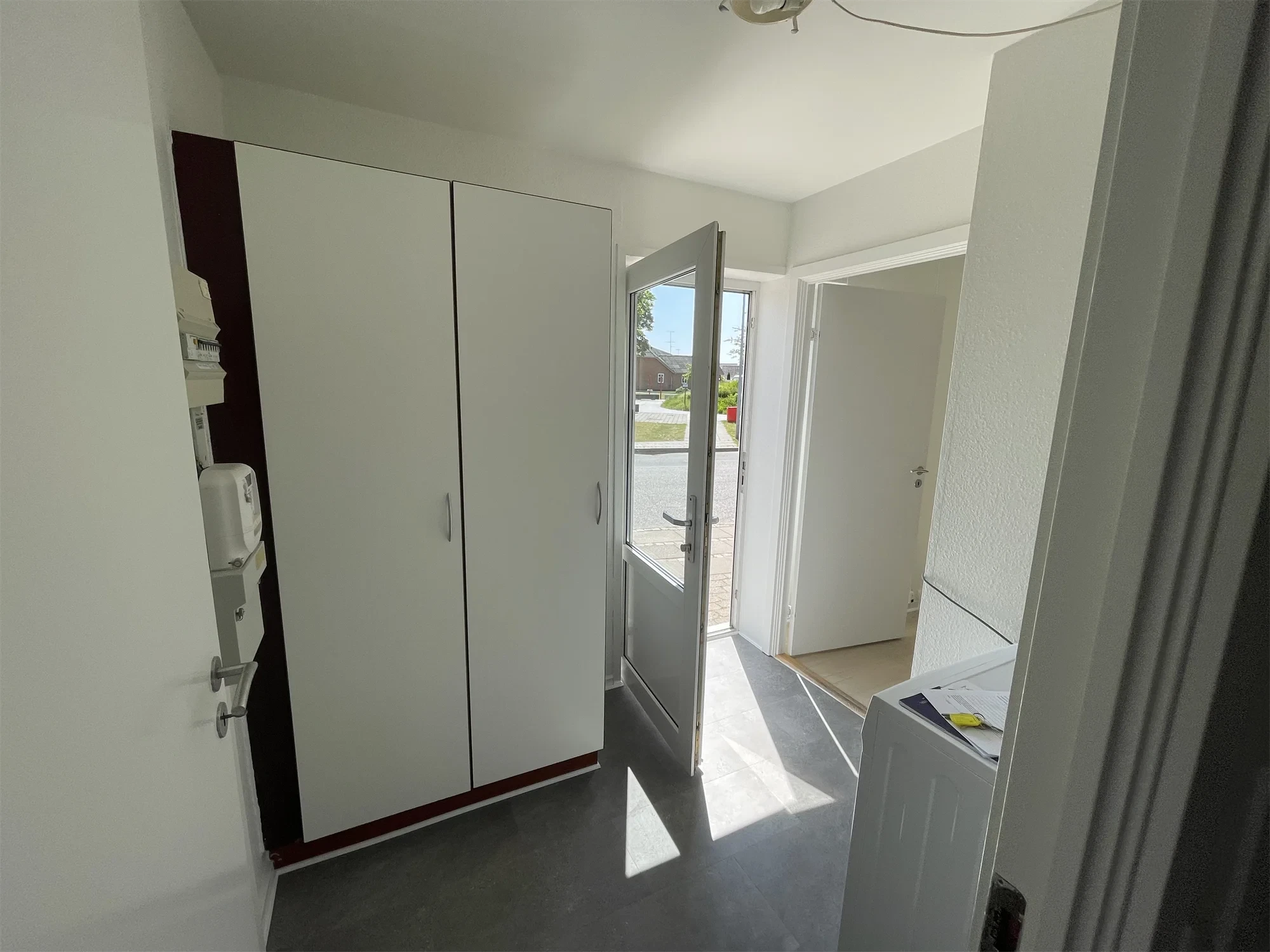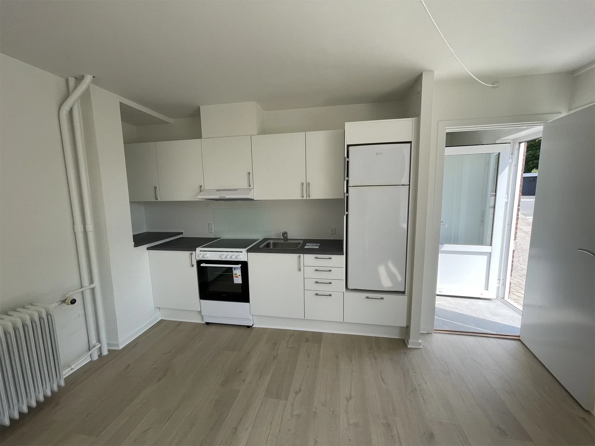 En fin 1. værelses lejlighed i Møldrup med helt nye gulve og nyt køkken på 28m2. I entreen med gaderobe skabene og vaskemaskinen, har man adgang ud til badeværelset og ind til soveværelse/stue og køkken der er i et rum.