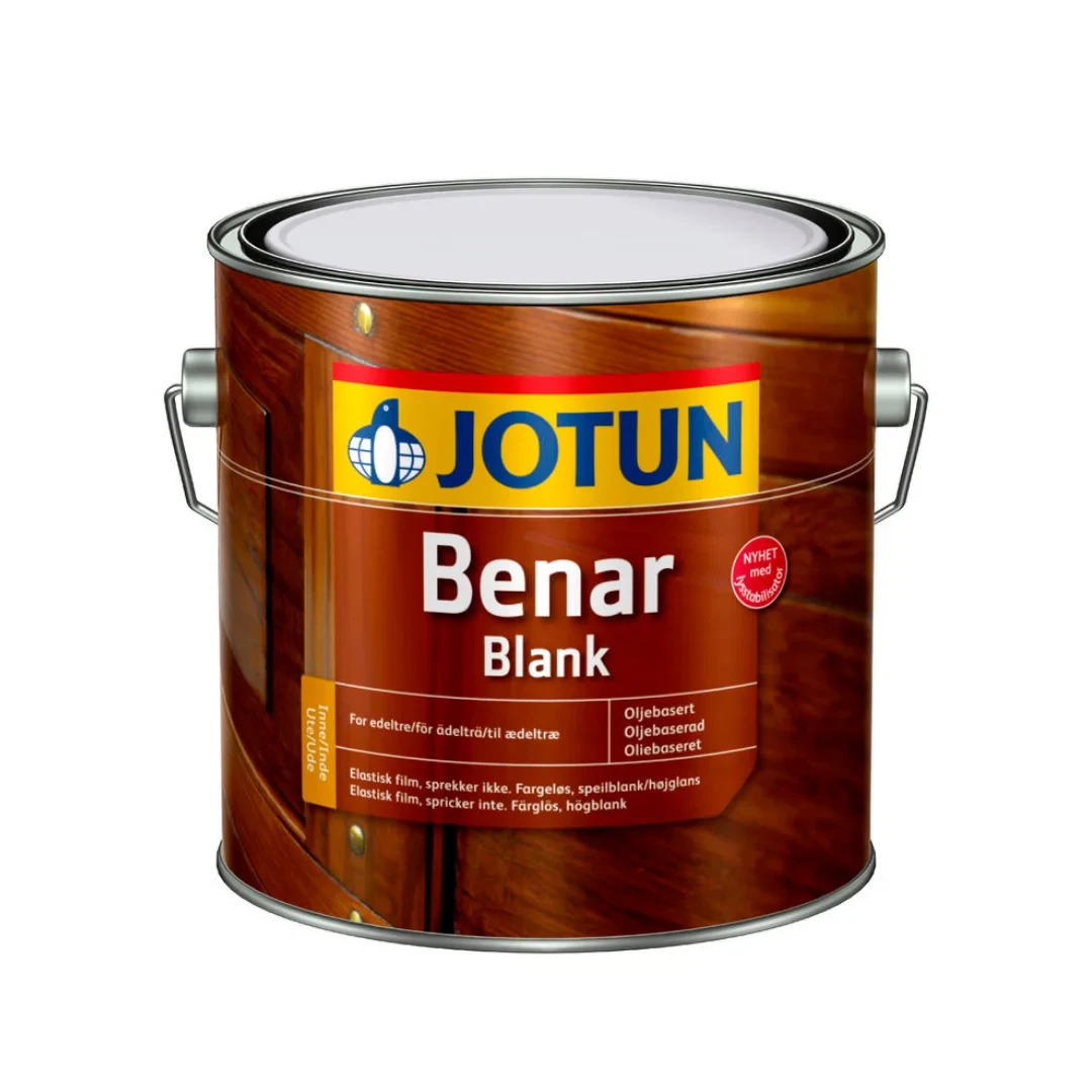 Blank, klar alkydolie med lysstabilisator til ædle træsorter til inden- og udendørs brug. Giver en elastisk og vandfastbeskyttelse. Giver en blank og vejrbestandig film, som beskytter træværket mod gråning og forvitring. Fremhæver træværkets naturlige lød. BENAR Blank giver god beskyttelse mod blærer, afskalning og hvide skjolder. God indtrængning og forankring i underlaget. Den bevarer sin elasticitet i længere tid og giver derfor en langvarig beskyttelse af alle træsorter og især ved ædeltræ. Anvendes på garageporte, døre, havemøbler, vinduer osv. Også velegnet som malerolie, siloolie etc.
