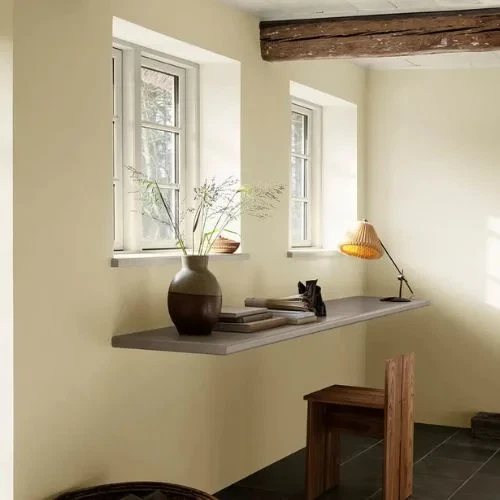 Jotun Contemporary White er en dæmpet, gylden beige, som fremstår lys og frisk. Farven er mørkere i nuancen end den velkendte Bomull.