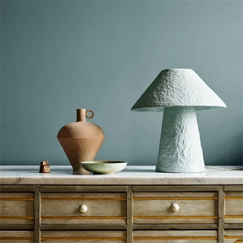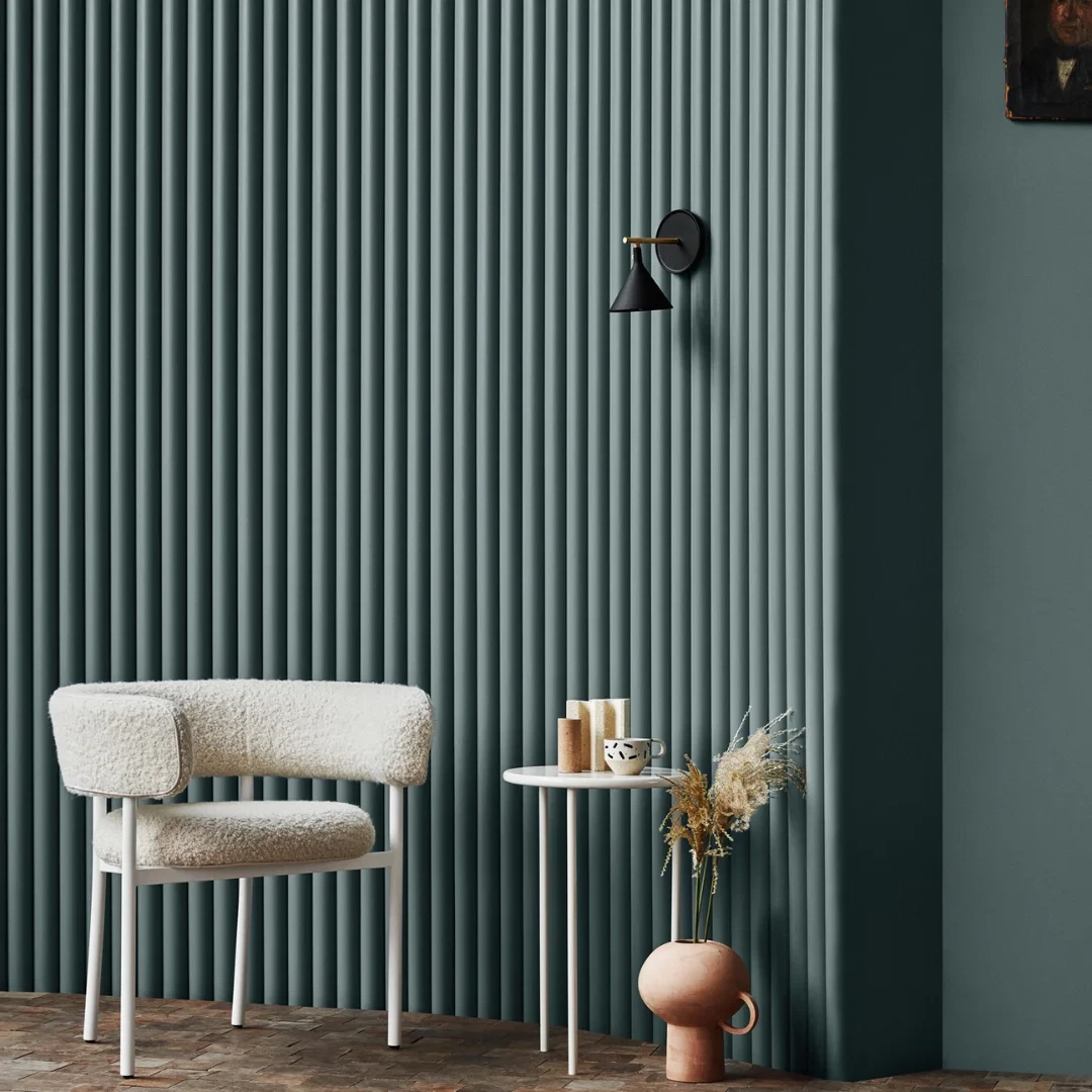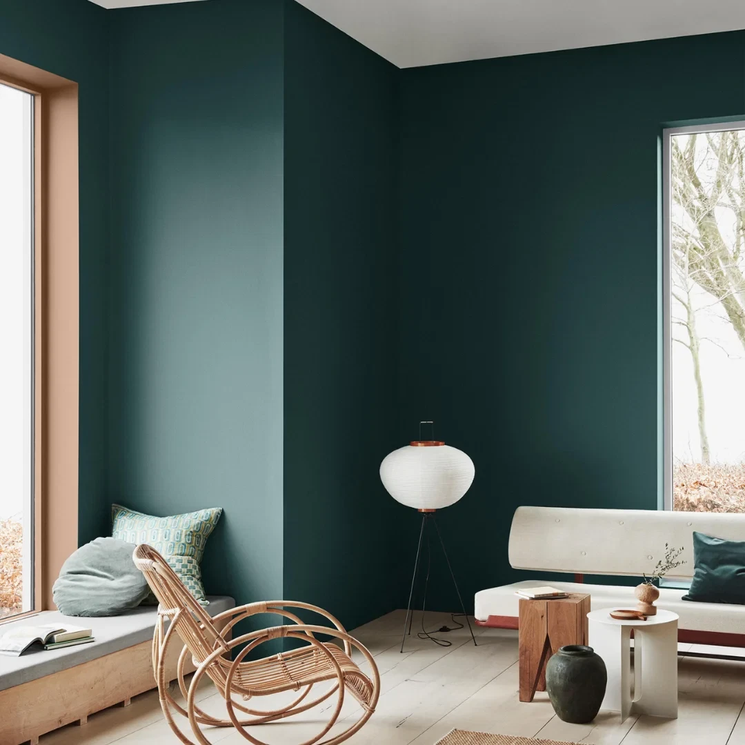 En frisk grønblå farve, der er helt sin egen. Den er dominerende, men bringer samtidig en ro og dybde til rummet.