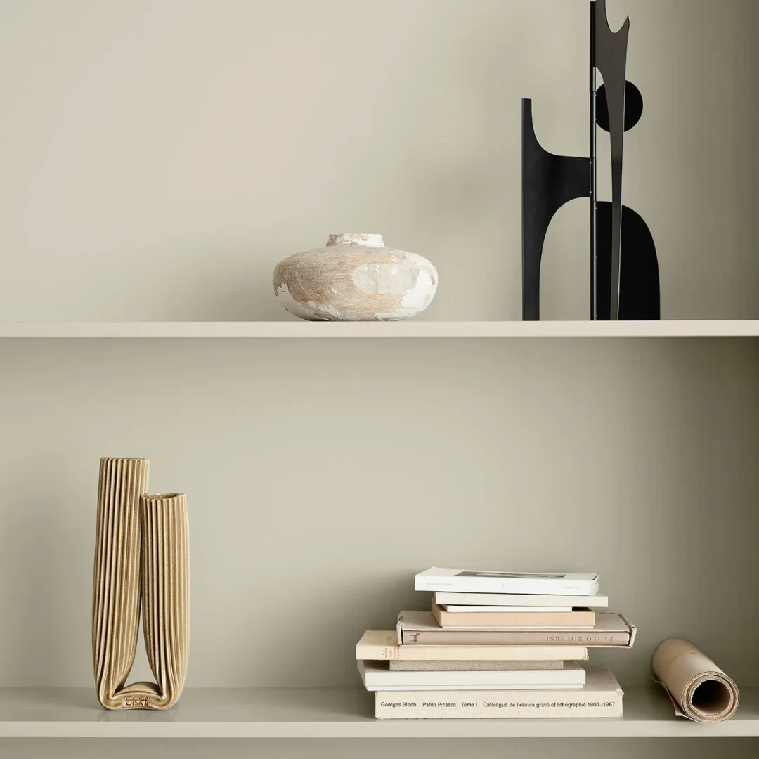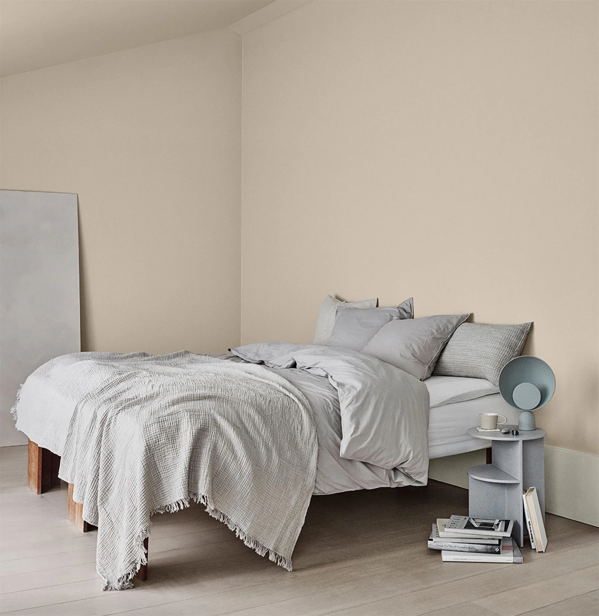 Soothing Beige 12075 er en af de mest populære - og det forstår vi godt. Den er afdæmpet og varm uden at blive for gylden. Den bryder flot med hvide karme og paneler og tilfører en behagelig stemning til rummet.