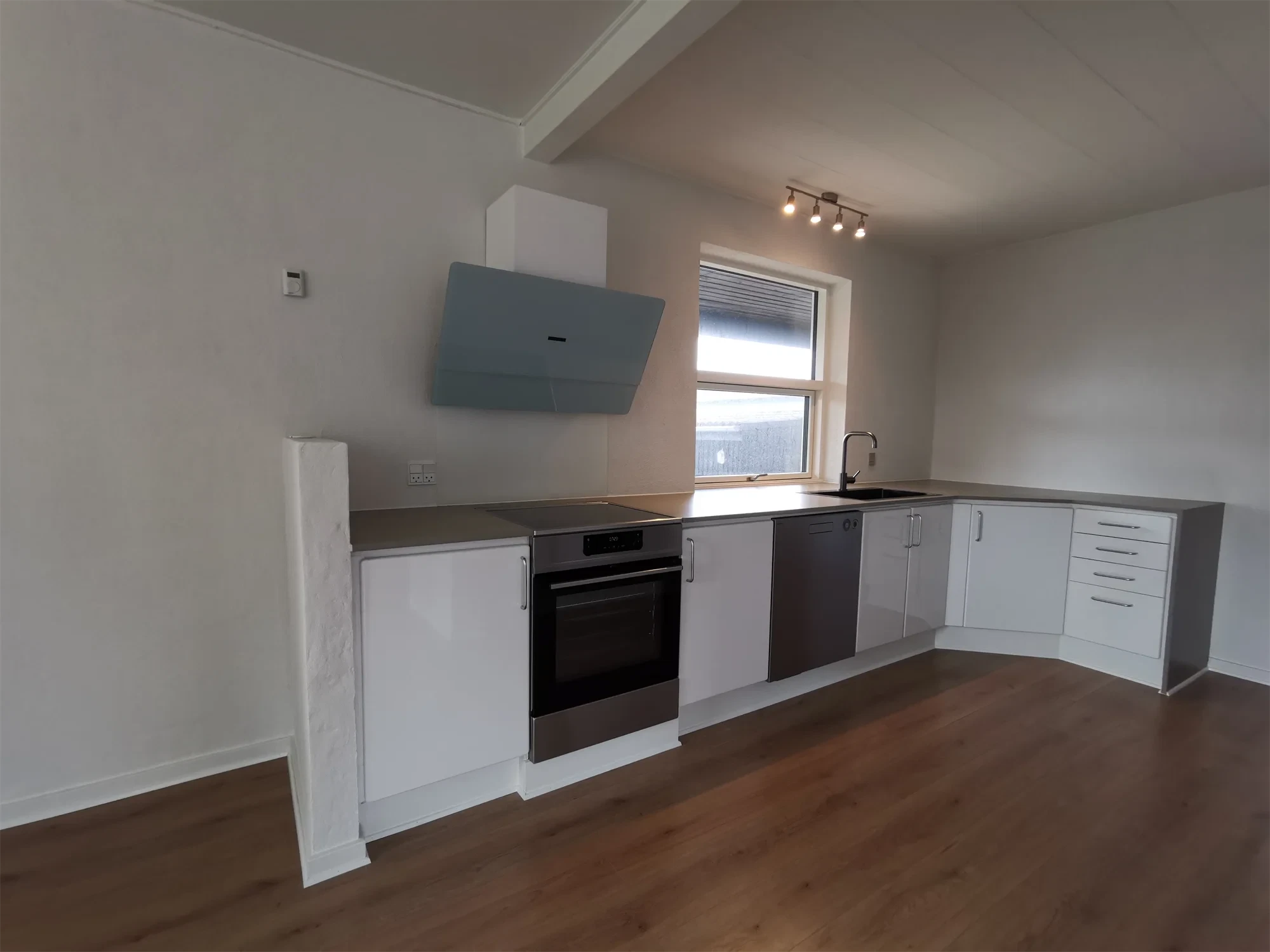 Huset rummer i stueetagen et toilet, køkken og stor stue ud i ét med gulvvarme. Her er der udgang til en flot forgang med trappe til 1. sal og ned til den flotte kælder.